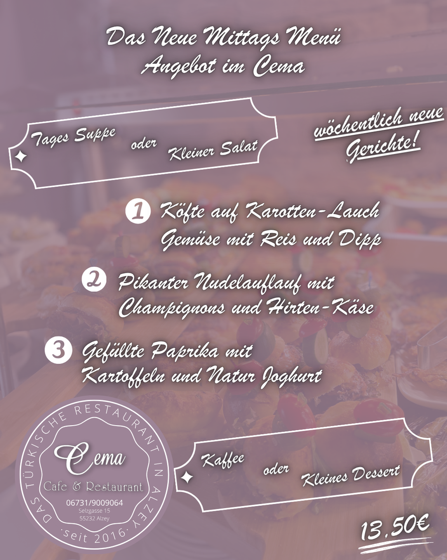 Jede Woche bieten wir unseren Gästen zum Mittagstisch DREI neue Hauptgerichte zur Auswahl an. Das Menü beinhaltet: